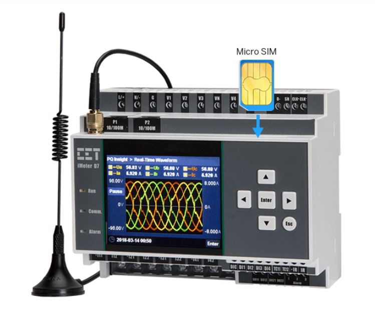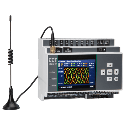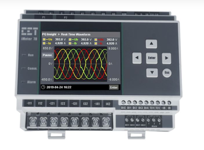 The iMeter D7 is CET’s Advanced DIN-Rail Mount PQ Analyzer designed for the compliance monitoring market as it offers un-surpassed functionality by combining Class 0.2S accuracy and advanced PQ features in a compact 145*124*77mm housing with a High-Resolution, IPS Color Dot-Matrix Display. The iMeter D7 complies with such standards as IEC 62053-22 Class 0.2S, IEC 61000-4-30 Ed.3 Class A, IEC 61000-4-15, IEC 61000-4-7, EN 50160, IEEE Std 519-2022 as well as IEC 61850 for Substation Automation. Further, it offers a large logging capacity with 4GB of on-board memory, extensive I/O, multiple Time Sync. methods, 2x100BaseT Ethernet and 1xRS-485 ports. In addition, it optionally supports wireless connection, 2xAI for measuring external transducer signal or 1xIresidual Input & 1xRTD for Leakage Current and Temperature Measurements. These features likely make the iMeter D7 the most advanced DIN-Rail PQ Analyzer for an intelligent Power Quality Monitoring System.