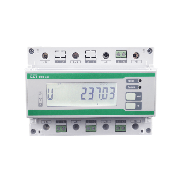 The PMC-340-A Digital Three-Phase Energy Meter is CET’s latest offer for the low voltage power/energy metering market featuring DIN rail mount, high accuracy, multifunction true RMS measurements and a large, easy to read LCD display. The PMC-340-A complies with the IEC 62053-21 Class 1 and IEC 62053-22 Class 0.5S kWh Accuracy Standards for 100A Direct Input and 5A CT Input, respectively. The PMC-340-A comes standard with a front panel LCD, Energy Pulse & Comm. Activity LEDs as well as a Solid State Pulse Output for energy pulsing. The standard RS-485 port and Modbus protocol support allows the PMC-340-A to become a vital component of an intelligent, multifunction monitoring solution for any Power and Energy Management Systems.